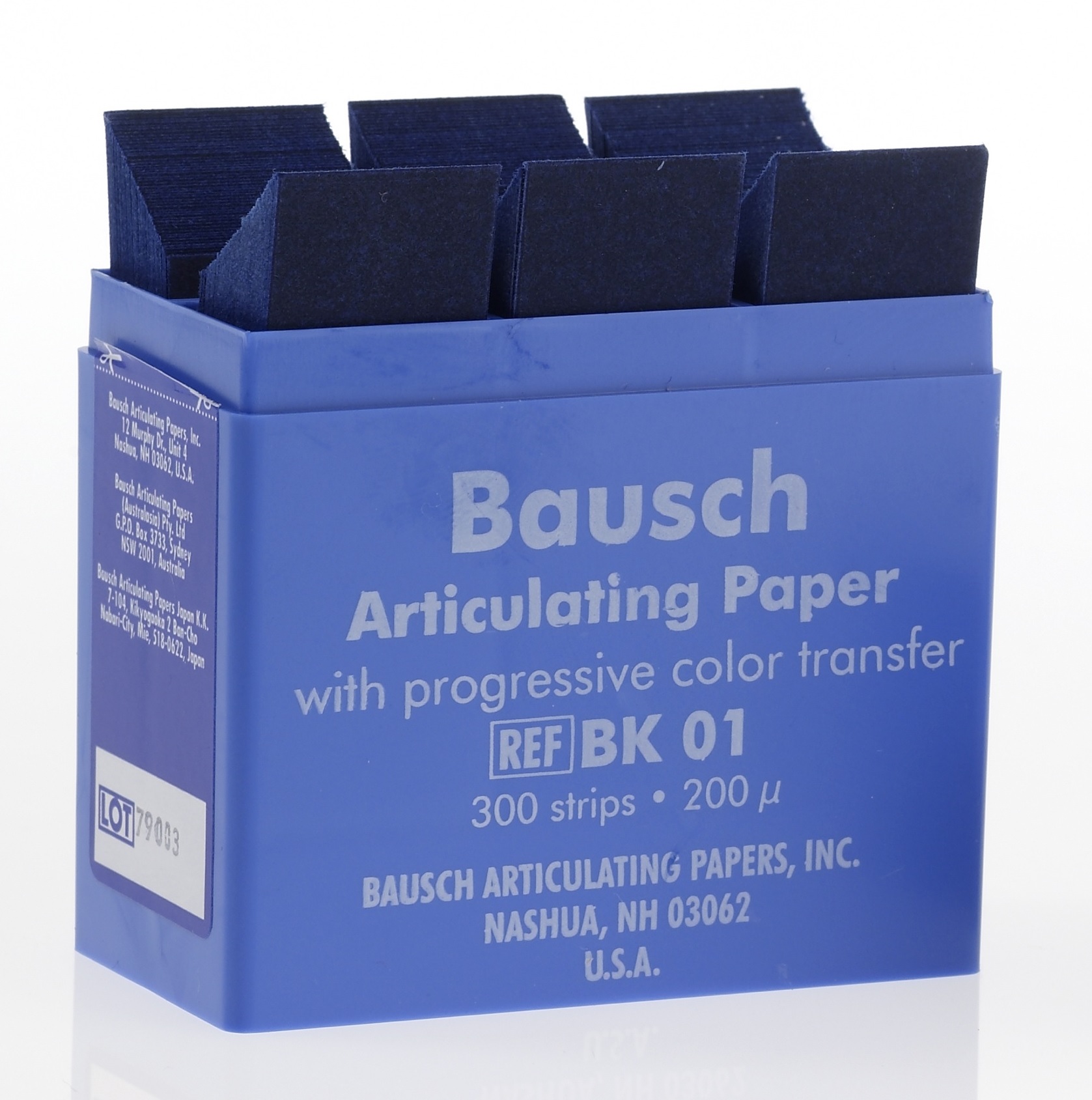 200 mikrónov tenký artikulačný papier s progresívnym farebným tónovaním - označuje rôzne sily zhryzu pomocou tónovaného zafarbenia (slabší zhryz bude svetlý, silný zhryz bude tmavý). Lekár získa presný reliéf rozloženia sily zhryzu. Kontakty sú okamžite viditeľné a môžu byť opracované. Len Bausch 200 artikulačný papier s progresívnym tónovaním môže odhaliť zhryzové interferencie. Po lokalizovaní chybných kontaktných bodov by ste mali použiť tenšie produkty na artikuláciu. K dispozícii na výber: BK 01 - plastový dispenser - MODRÝ - 300ks BK 02 - plastový dispenser - ČERVENÝ- 300ks BK 05 - trhací blok - 300ks