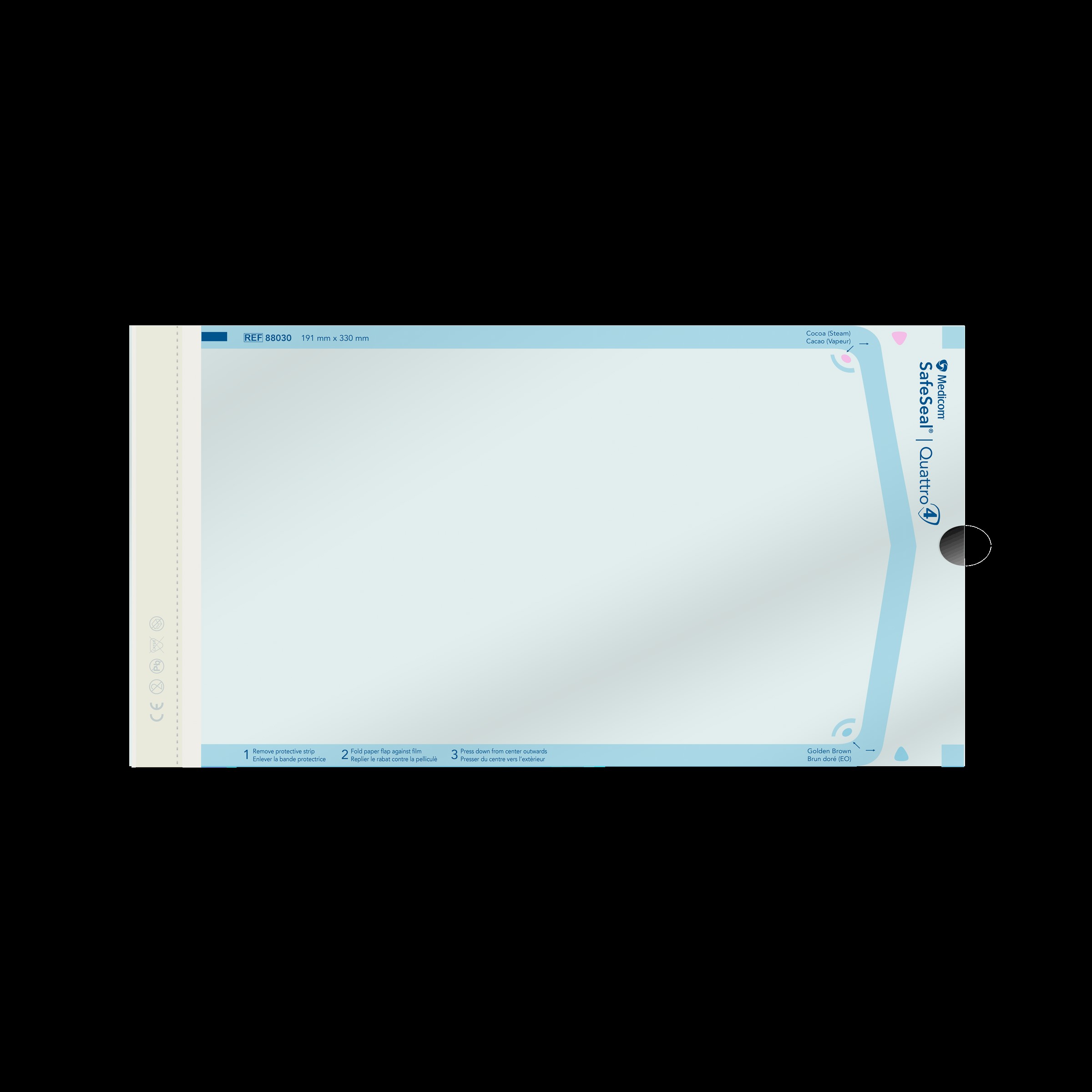 Medicom® SafeSeal® Quattro sterilizačné sáčky. Samotesniace sterilizačné sáčky. Zmenou farby poskytujú vizuálny dôkaz o sterilizácii. Sú kompatibilné s parnými aj chemickými autoklávmi.