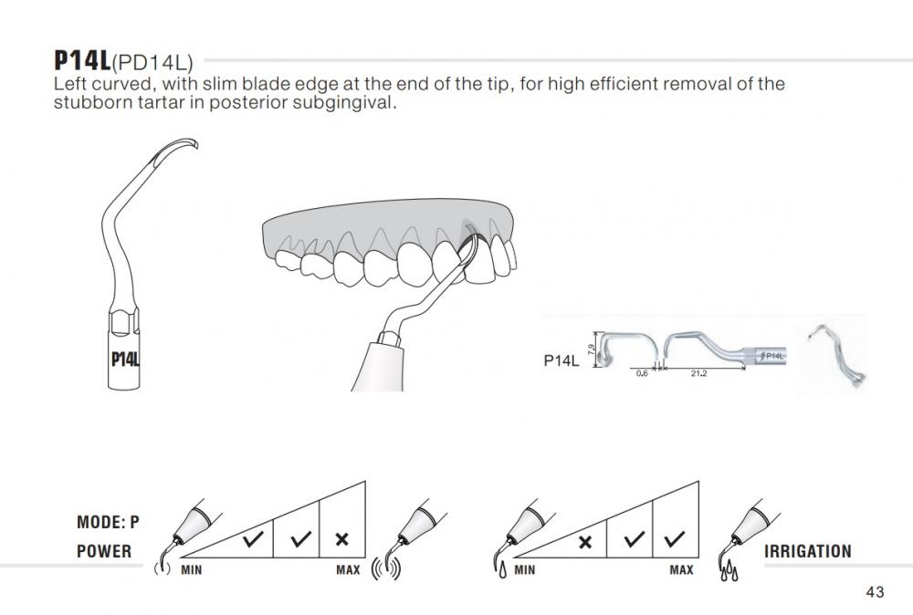 Koncovka ľavá, s tenkou čepeľou na konci hrota, pre vysoko účinné odstránenie odolného zubného kameňa v zadnej subgingiválnej oblasti.