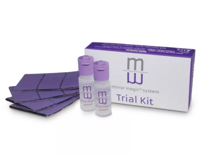 Úvodný set MagicMirrorTM obsahuje: 2× fľaštičku tekutiny Anti-fog a 6ml 24ks samolepiacich penových tampónov